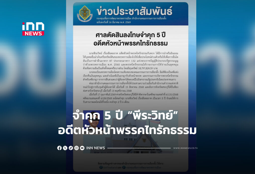 กกต.เผย ศาลตัดสินลงโทษจำคุก 5 ปี “พีระวิทย์” อดีตหัวหน้าพรรคไทรักธรรม คดีทุจริตเงินอุดหนุนกองทุนพัฒนาการเมือง ถูกจับเมื่อปี68 เคยหนี กบดาน สปป.ลาว