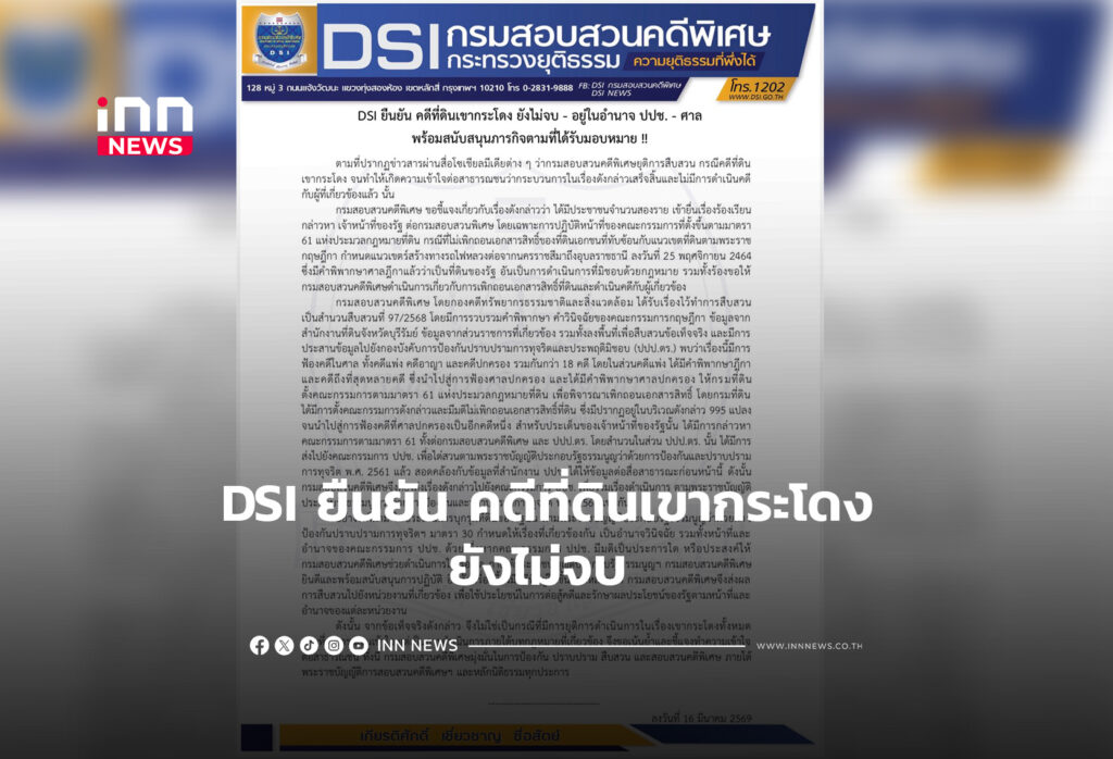 DSI ยืนยัน คดีที่ดินเขากระโดง ยังไม่จบ - อยู่ในอำนาจ ปปช. - ศาลพร้อมสนับสนุนภารกิจตามที่ได้รับมอบหมาย