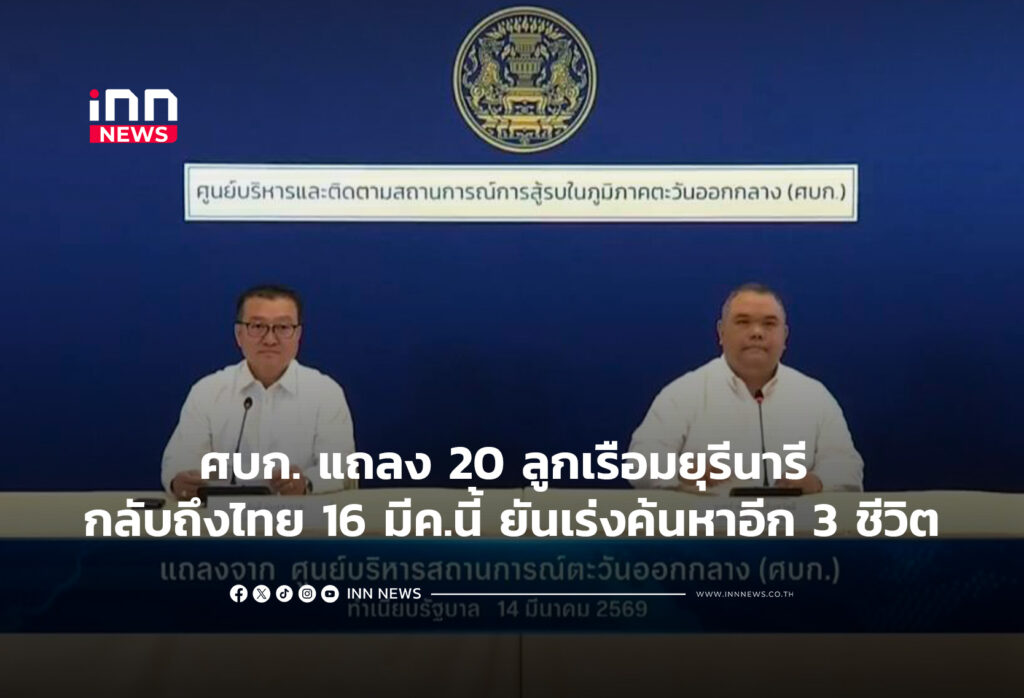 ศบก. แถลง 20 ลูกเรือมยุรีนารี กลับถึงไทย 16 มี.ค.นี้ ยัน เดินหน้าค้นหาอีก 3 ชีวิต ยํ้าเตือนคนไทย เร่งออกจากพื้นที่เสี่ยง หลังอิหร่านยกระดับโจมตี
