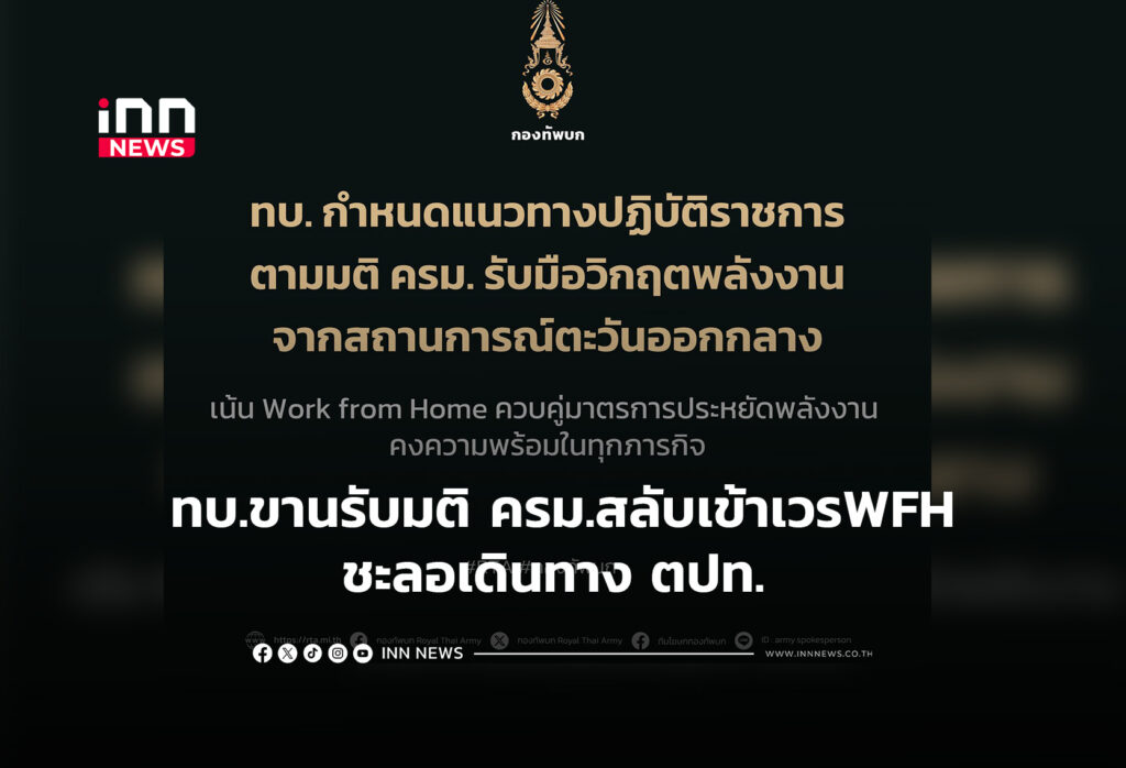 ทบ.ขานรับมติ ครม.รับมือวิกฤตพลังงานโลก เปิด WFH สลับเข้าเวร คุมแอร์ 26 องศา ชะลอเดินทาง ตปท.