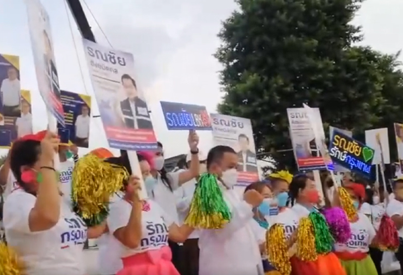 โดยบรรดากองเชียร์ของผู้สมัครแต่ละคน ต่างพากันถือป้ายผู้สมัคร ทั้งผู้ว่าฯ กทม. และ ส.ก. รวมถึงการแต่งกายที่สร้างสีสันของกองเชียร์ แต่ไม่มีการใช้เครื่องขยายเสียง กลองยาว แตรวง เนื่องจากผิดกฎหมายเลือกตั้งท้องถิ่น ซึ่งแต่ละกลุ่มปฏิบัติตามข้อระเบียบอย่างเคร่งครัด
